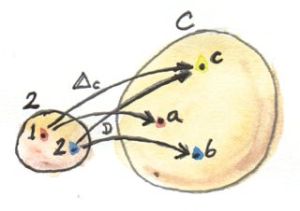 积的构造始于对两个对象a和b的选择,我们想要构造这二者的积。首先,“选择对象”到底意味着什么?我们能否用范畴论中的术语来描述这一动作?两个对象形成了一个非常简单的模式,我们可以将这个模式抽象到一个非常简单的范畴。我们将这个范畴称为2,它只包含了1和2两个对象,除了两个必须存在的恒等态射,也没有其他态射了。现在可以将“从范畴C中选择两个对象”的行为表述为“定义一个从范畴2到范畴C的函子D”。一个函子将对象映射到对象,因此它的象只是两个对象(也可能是一个,若该函子映射对象时有坍缩行为的话);函子也映射态射,在当前情况下只是将恒等态射映射成恒等态射。